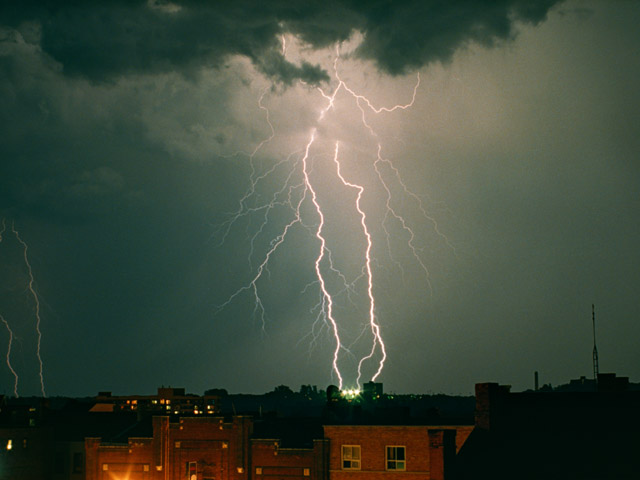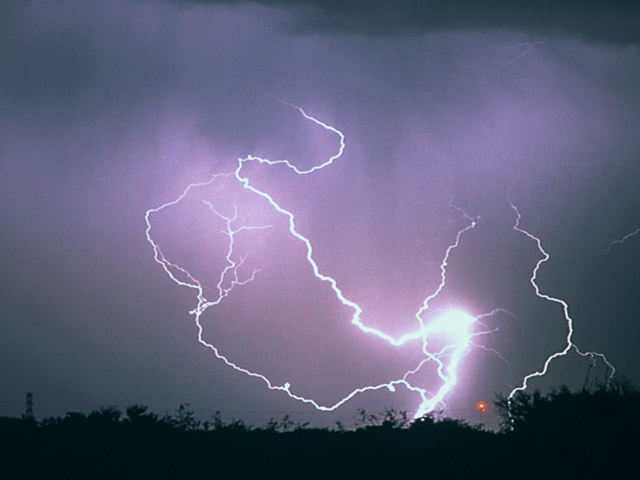 - • Quando le due si incontrano (ad un altezza media di 30-50 metri), si instaura una forte corrente elettrica nel canale (largo poco più di una matita). Le due scariche segnano nell'aria una scia di congiunzione tra cielo e terra lungo la quale risale verso la nube una fortissima corrente elettrica ad una velocità stimata in circa un terzo di quella della luce (130 milioni di metri al secondo). Una volta creato il canale ionizzato altri fulmini possono utilizzarlo (producendo una caratteristica luce intermittente)