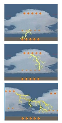 - • Fulmine nube-terra partono dalla base della nube, caricata negativamente, e giungono al suolo caricato positivamente. La superficie terrestre e gli oggetti sopra la stessa conducono l'elettricità molto meglio dell'aria: perciò i fulmini sfruttano il "potere delle punte" seguendo il percorso più breve ed abbattendosi su montagne, campanili, antenne, grandi alberi isolati.