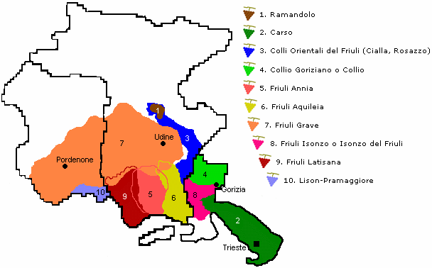 Il Friuli Venezia Giulia è produttore di una vasta gamma di vini con centinaia di qualità organolettiche diverse. I bianchi in particolare sono concorrenziali ai bianchi californiani tra i migliori al mondo, merito della tipicità del terreno specialmente nella zona del confine sloveno. La Grave del Friuli, dove spiccano i vini rossi, l’Aquileia, l’Isonzo, dal tipico Tocai, il Collio, i Colli Orientali del Friuli, il Carso triestino, dove spicca in particolare il Terrano, sono le zone della produzione D.o.c. del Friuli Venezia Giulia.